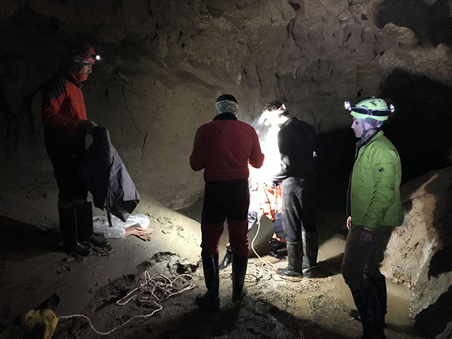 از عمق 1000 تا 1300 فرودهای کوتاه و بلند و در برخی نقاط عبور از تراورس های کوتاه داشتیم اما درگیر شدن با آب کمتر از عمق 600 تا 1000 بود. حدود ساعت 3 بعد از ظهر بود که به انتهای غار در عمق 1316 متری رسیدیم، یعنی جایی که در سال گذشته به آن رسیده بودن و قرار بود که ادامه اکتشاف از این نقطه شروع شود. جایی که به یک سیفون می رسد در این نقطه تقریبا آن همه سر و صدای آب گم می شود و به یک سکوت می رسد. با وجود همه تلاشی که کردیم باز لباس هایمان خیس شده بود بنابر این مجبور بودیم هر چه سریع تر محلی را برای کمپ محیا کنیم. بنابراین جایی در سمت چپ مسیر حرکت آب، حدود سه متر بالاتر از کف و حدود 20 متر قبل از سیفون انتهای غار بر روی زمین محل کمپی به اندازه 2 متر در 2 متر ایجاد کردیم. خوشبختانه این قسمت خاک نرمی داشت که با استفاده از یومار توانستیم سطح شیبدار را هموار کرده و یک محل کمپ بسیار مناسب ایجاد کنیم.